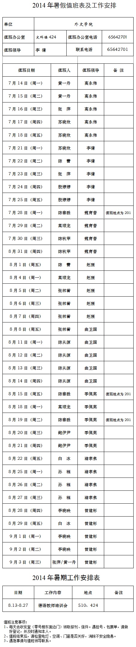 2014年外文学院暑假值班及工作安排表
