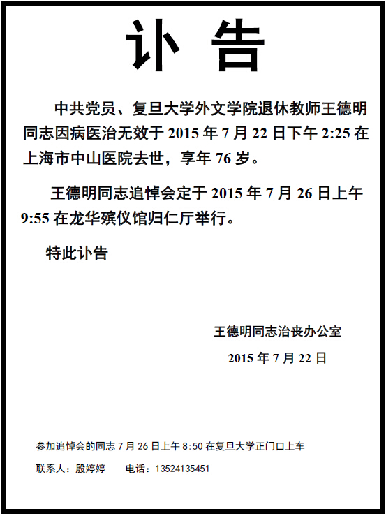 外文学院退休教授王德明同志讣告