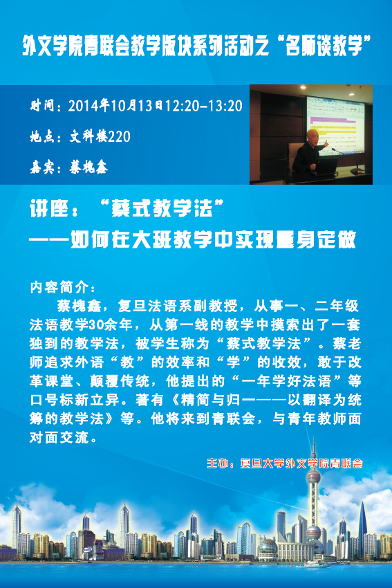 本期嘉宾是:法文系的蔡槐鑫老师。他将从30多年的基础法语教学经验出发,与我们分享他对于外语教学的独到见解。本期沙龙的题目是《如何在大班教学中实现量身定做》。