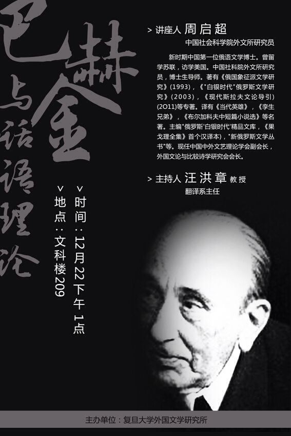 12月22日(周一)下午1点在文科楼209室,汪洪章教授将主持“巴赫金与话语理论”讲座。讲座由中国社会科学院外国文学院所周启超研究员主讲。