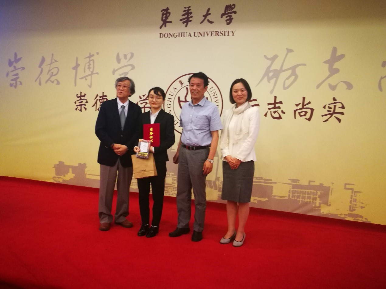 周依林同学获奖后与评审专家塚本慶一老师、庞志春老师及指导教师艾菁老师合影