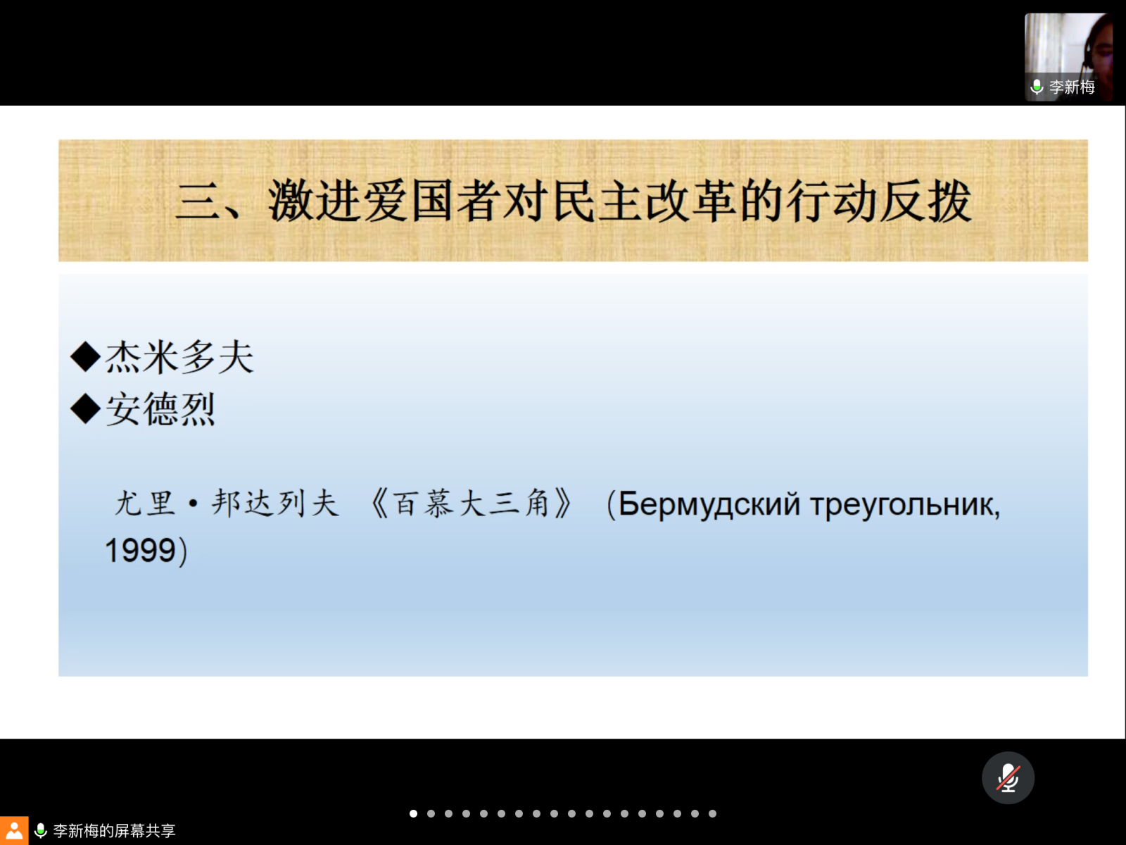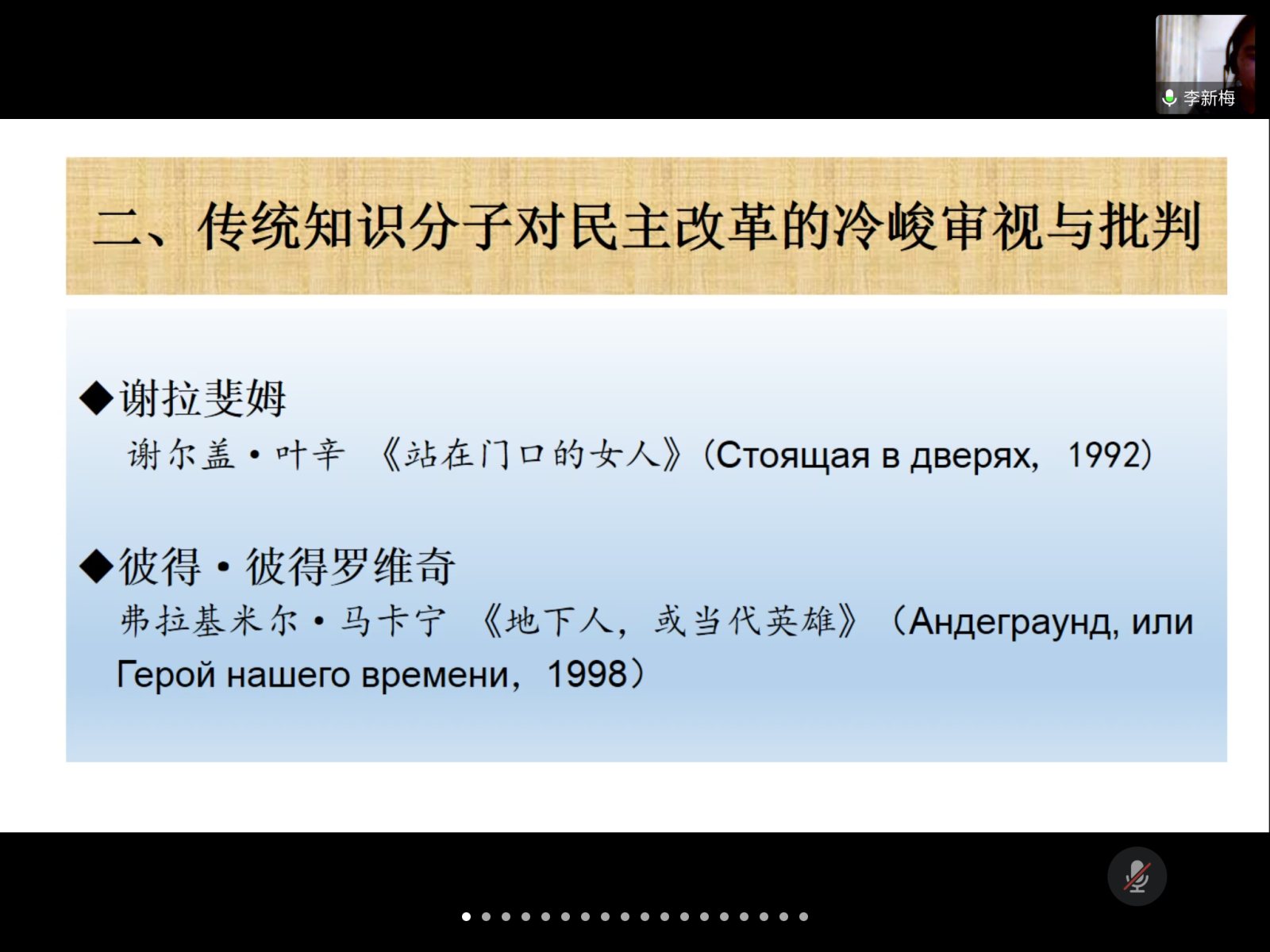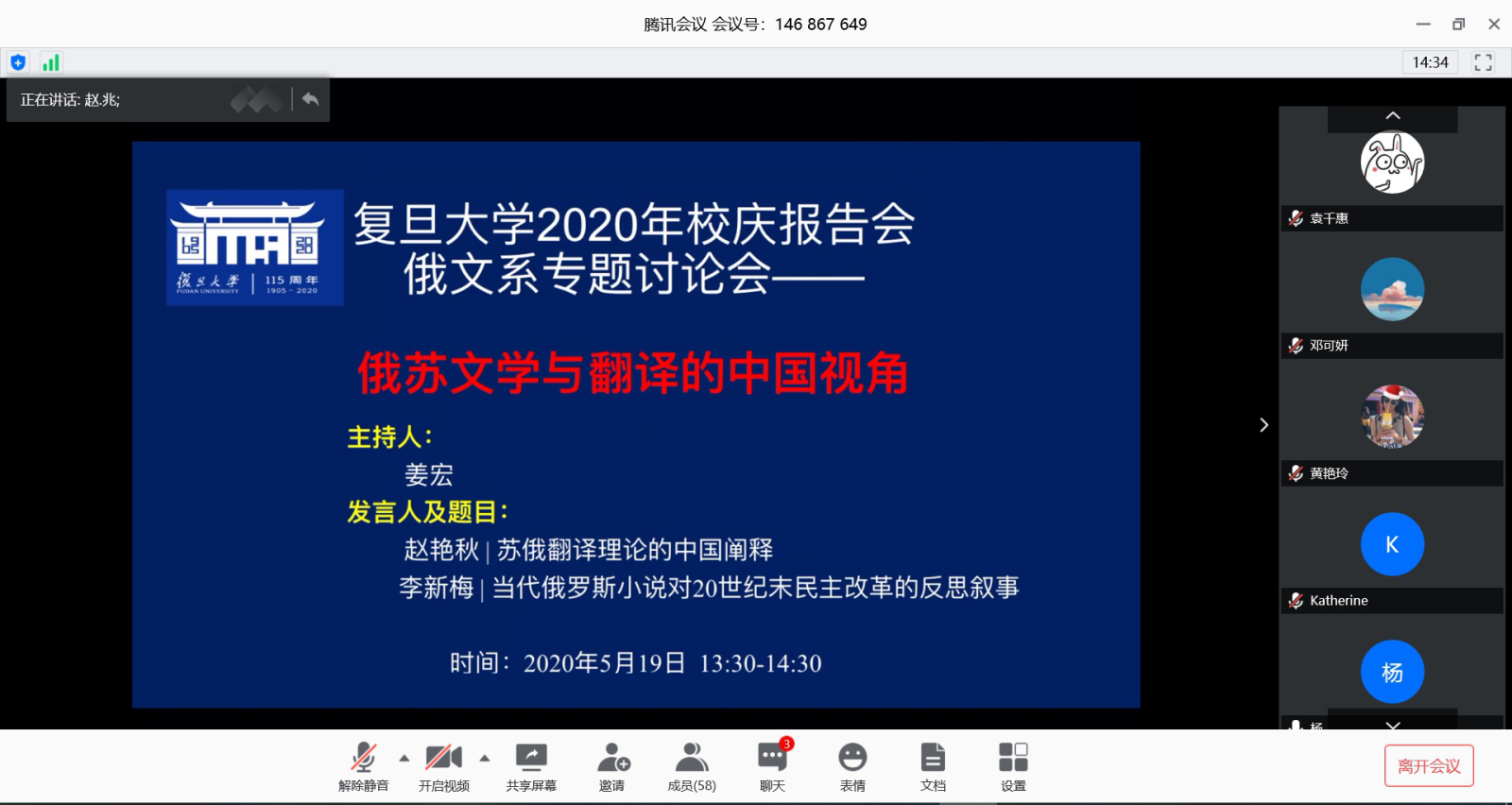 2020年5月19日,leyu乐鱼官方web站登录入口,乐鱼(中国)外文学院俄文系2020年校庆学术报告会暨专题讨论会“俄苏文学与翻译的中国视角”成功在线举办。会议由俄文系主任姜宏教授主持,俄文系教师赵艳秋、李新梅分别进行报告。60多位师生参会。