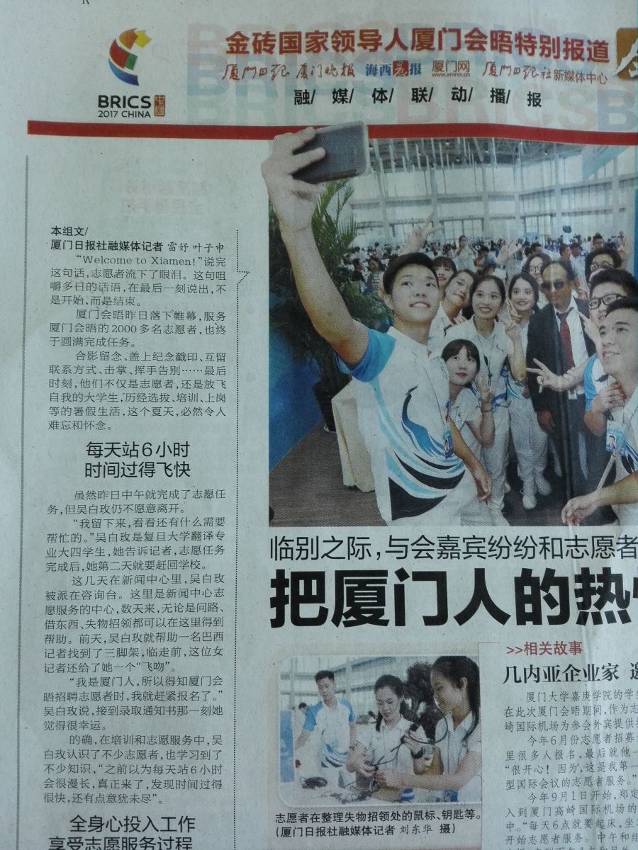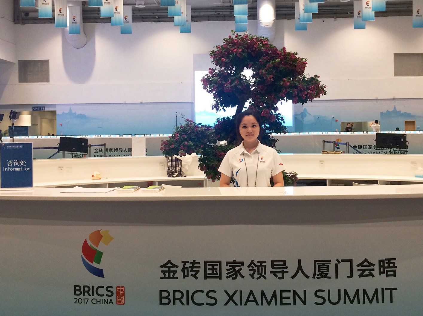 2017年9月,金砖国家领导人厦门会晤如约召开。短短的几天内,厦门成为了全球瞩目的焦点,金砖成为了世界热议的话题。而我作为一位地地道道的厦门人,有幸成为一名“小白鹭”(厦门会晤青年志愿者),为四海宾朋提供温馨、周到的服务,为会晤的顺利召开贡献自己的力量。