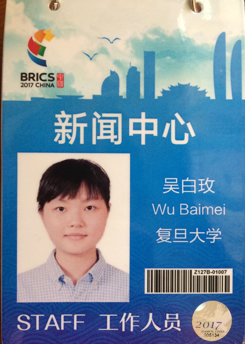 除此之外,这次厦门会晤的志愿者经历还让我增加了对自己身份的认同感。首先是对“厦门人”这个身份的认同。“厦庇五洲客,门纳万顷涛”。作为东道主,我不仅是感受者,更是参与者。在接受央视焦点访谈、厦门卫视以及厦门日报的采访中,我多次提到了自己来参加志愿者的初衷之一就是因为“我是个厦门人”,我为我的城市骄傲、自豪,也迫切地想要为她贡献自己的力量。其次是对“复旦人”这个身份的认同。在复旦英翻学习生活的这三年,我拥有了较为扎实的英文翻译功底和交际能力,而这一点恰恰在此次志愿服务中派上了大用场。例如,我化解了电脑技术人员和一名外国记者间的误会,用自己所掌握的相关专业词汇,帮助技术人员进行翻译、解释,最终成功解决了问题,避免了事态的恶化。为此,新闻中心通信保障组负责人和厦门团市委向我提出了表扬,以表示对我工作的积极肯定。
