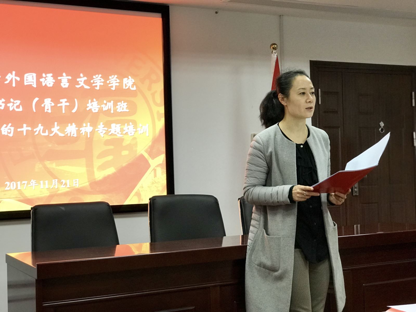 分党委书记李倩进行开班动员并作学习宣传贯彻党的十九大精神专题党课。她指出,要把学习宣传贯彻党的十九大精神作为当前和今后一个时期的首要政治任务。党的十九大是在全面建成小康社会决胜阶段、中国特色社会主义进入新时代的关键时期召开的一次十分重要的大会,对新时代推进中国特色社会主义伟大事业和党的建设新的伟大工程作出了全面部署。习近平总书记的报告是党团结带领全国各族人民在新时代坚持和发展中国特色社会主义的政治宣言和行动纲领,是马克思主义的纲领性文献。大会选举产生了新一届中央领导机构,通过了《中国共产党章程(修正案)》,是一次不忘初心、牢记使命、高举旗帜、团结奋进的大会。当前和今后一个时期,全校的首要政治任务就是学习好、宣传好、贯彻好党的十九大精神。对于外文学院,一方面要继续坚持立德树人,提升育人质量,注重“德才兼备、全面发展”,为中国特色社会主义事业培养合格建设者和可靠接班人;另一方面要以参与“双一流”建设为契机,聚焦一流、深化改革,推进学术研究、队伍建设、人才培养和社会服务,主动融入学校发展,全面加快学院各项事业的发展。要结合学院实际,认真开展好学院党员师生学习宣传贯彻党的十九大精神的工作。按照“学懂、弄通、做实”的要求,根据校党委有关文件精神和工作部署,分党委制订工作计划,将学习宣传贯彻党的十九大精神与继续深入贯彻全国高校思想政治工作会议精神,深入推进“两学一做”学习教育常态化制度化,深入开展师德师风和校风学风建设,加快“双一流”建设步伐紧密结合起来。坚持班子率先学习、基层广泛动员,坚持突出核心队伍、覆盖全院师生,坚持学深悟透精神、切实推进工作,通过学习贯彻党的十九大精神,全面促进学院党的建设,为学院各项事业的发展提供坚强有力的组织保障。要抓好党支部书记和骨干队伍建设,把牢基层党建“生命线”,全面推进学院党建工作。分党委将继续落实好“一个工程”、“五大机制”,为开展基层党建工作提供更多的支持和更好的保障,充分调动每一位党员的积极热情、激发每一个党支部的生机活力。党支部书记和骨干要在学习宣传贯彻的过程中发挥好带头表率作用,要自己先学一步、学深一步,坚持全面准确、原原本本学习报告、党章和讲话,做到学深悟透;要带领所在党支部落实好学习贯彻任务,通过开展形式多样的学习实践活动,让每一位党员都能够真正掌握、深刻领会党的十九大精神的丰富内涵;要带动所在系部、班级的学习活动,组织广大师生学好领会党的十九大精神,把学习宣传贯彻党的十九大精神引向深入。