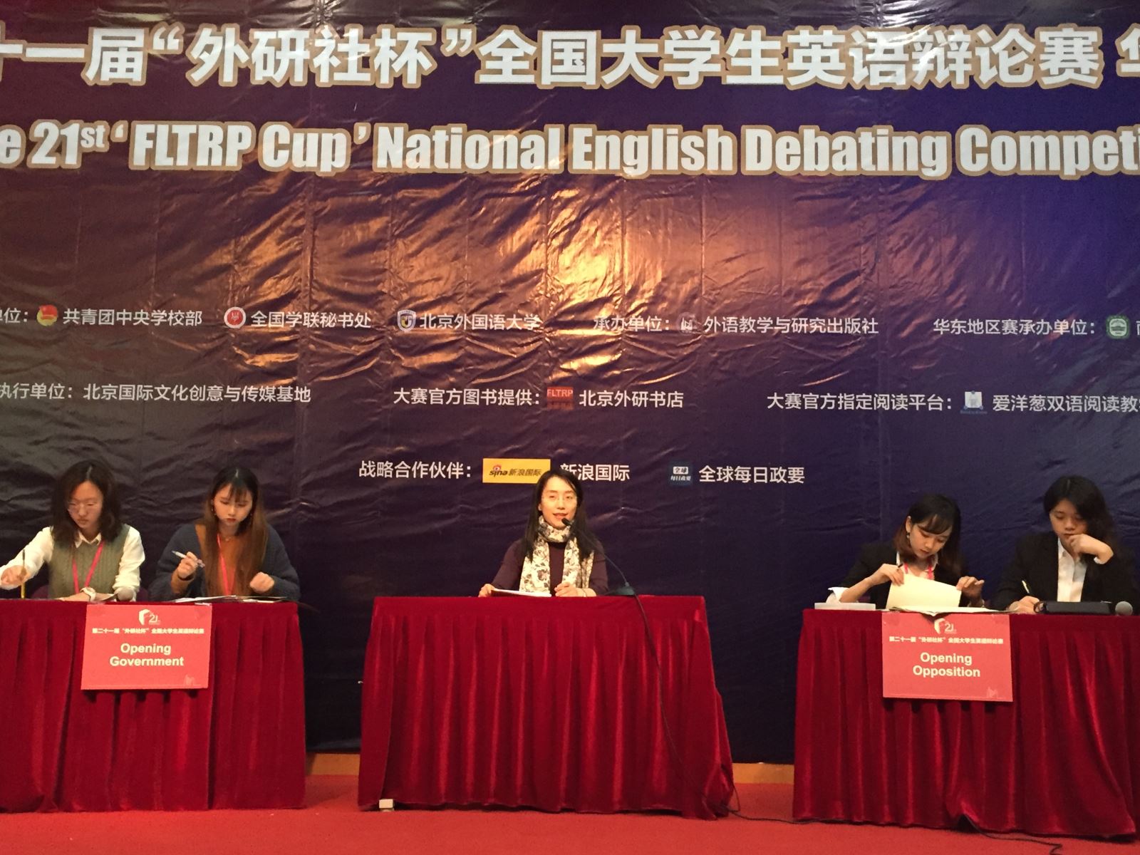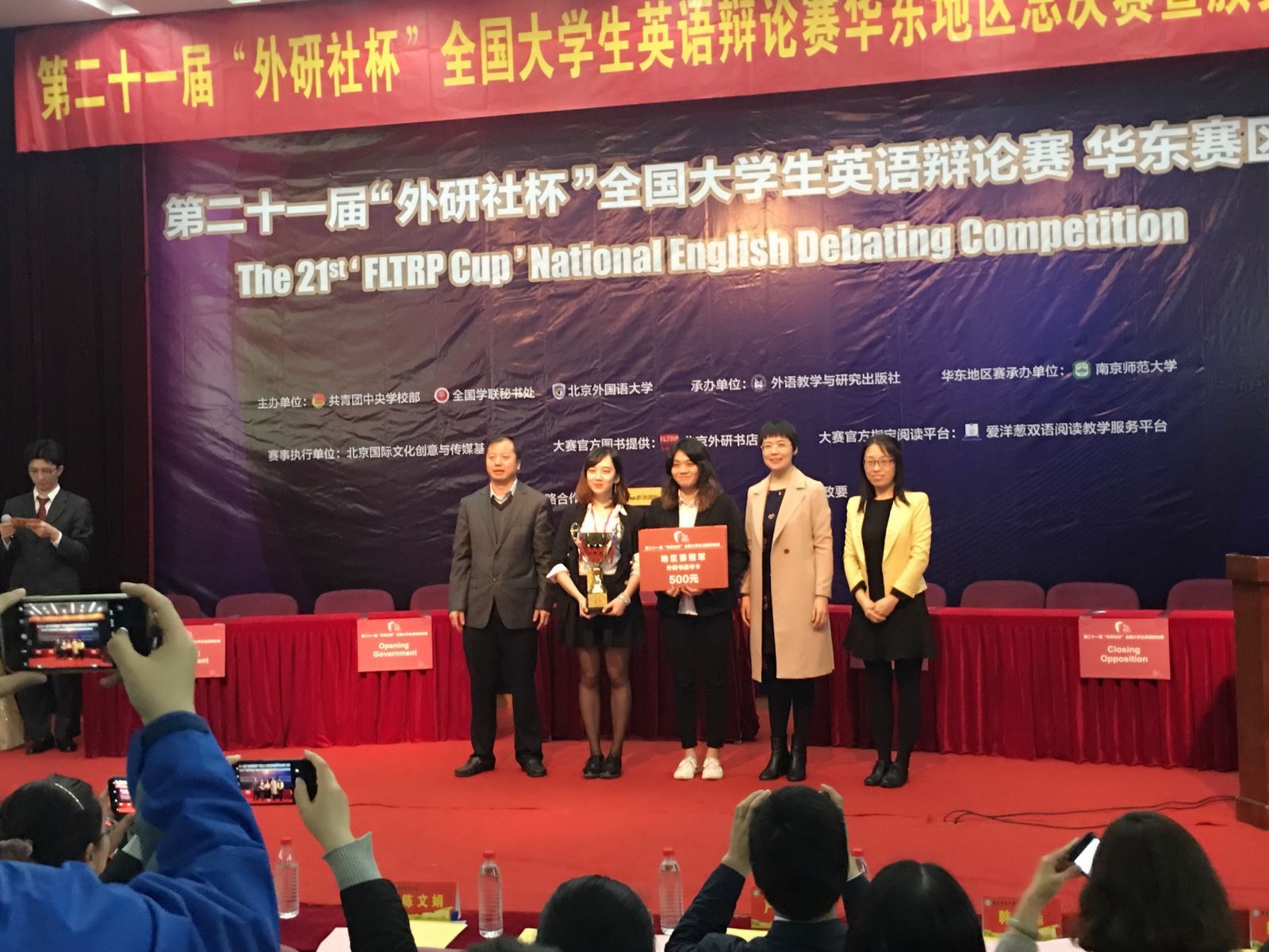 2018年4月5-7日,第二十一届“外研社杯”全国大学生英语辩论赛华东区决赛在南京师范大学举行。本次参赛队伍107支。2016级英语系本科裘泽慧与唐溪若同学(指导教师何静)在五轮循环赛中每轮均取得第一名,最终以队伍排名和个人积分排名均第一的成绩进入总决赛。总决赛四支队伍为南京航空航天大学、leyu乐鱼官方web站登录入口,乐鱼(中国)、南京师范大学和上海外国语大学。