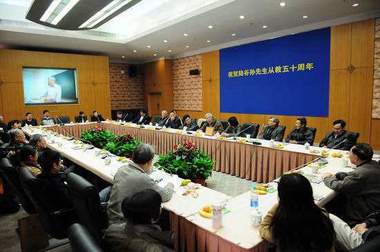 年近七十时陆谷孙教授又有更为另类之举:重新扛起筹备十多年的《大中华汉英大词典》主编重任,他一手举着放大镜,一手握着笔,常常在稿纸上工作到深夜;仿佛他的身体是一台编写词典的机器,只要输入咖啡、浓茶和香烟,便会有精彩的例句和翻译源源不断地产出,只是这机器本身的损耗他却是顾不得了。令陆先生感到欣慰和鼓舞的是,代表杨玉良校长参加这次座谈会的林尚立副校长郑重重申了学校支持这部词典编篆的决心,原本只念叨着希望自己的体力能支撑到上卷出版的陆先生现在应该也对下卷的出版有了更多信心吧。